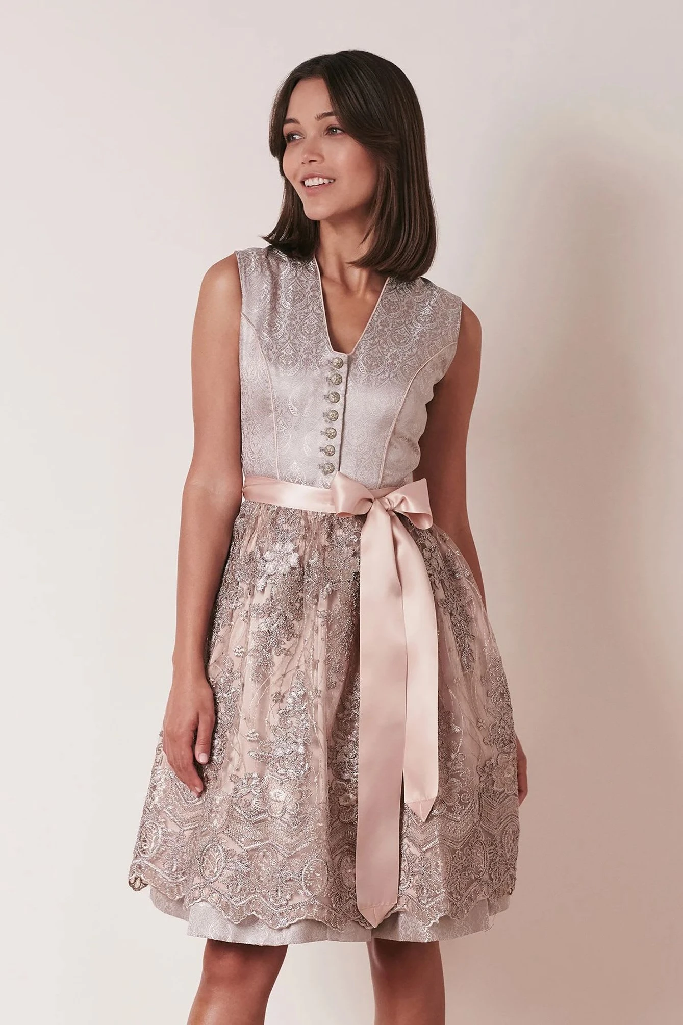 Das Dirndl Nala glänzt mit einem schicken Ornamenten-Muster. Eine schöne Knopfleiste und ein V-Ausschnitt zieren das Dirndl. Die atemberaubende Spitzenschürze macht das Dirndl zum Eye-Catcher!
