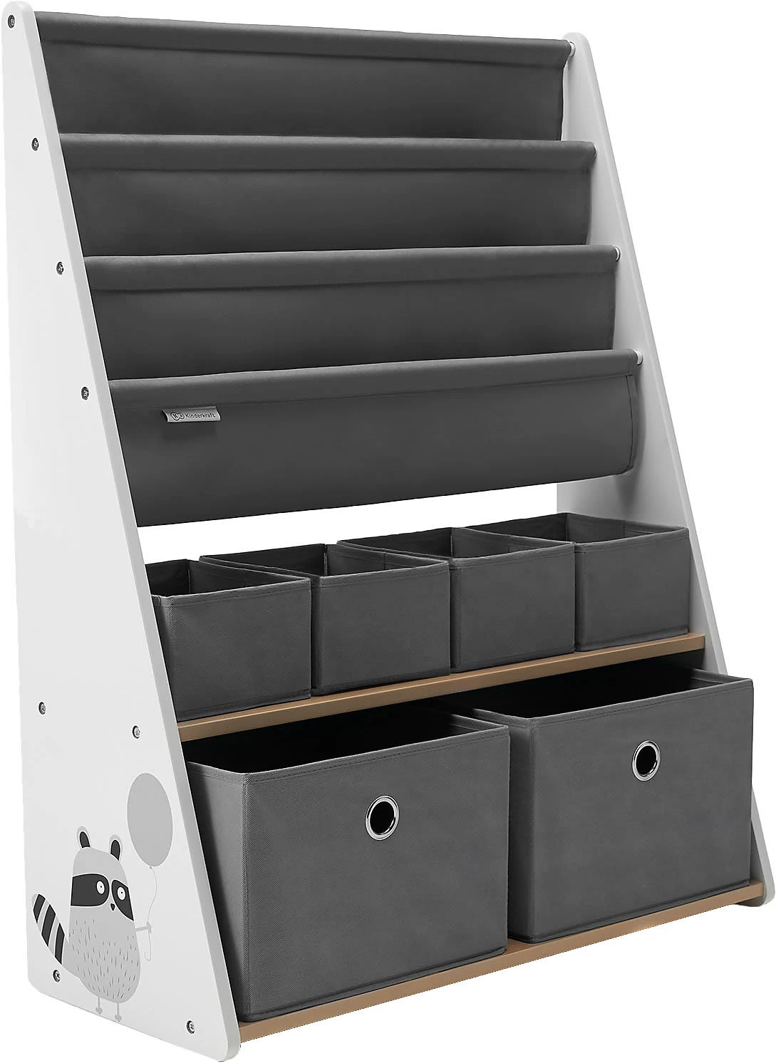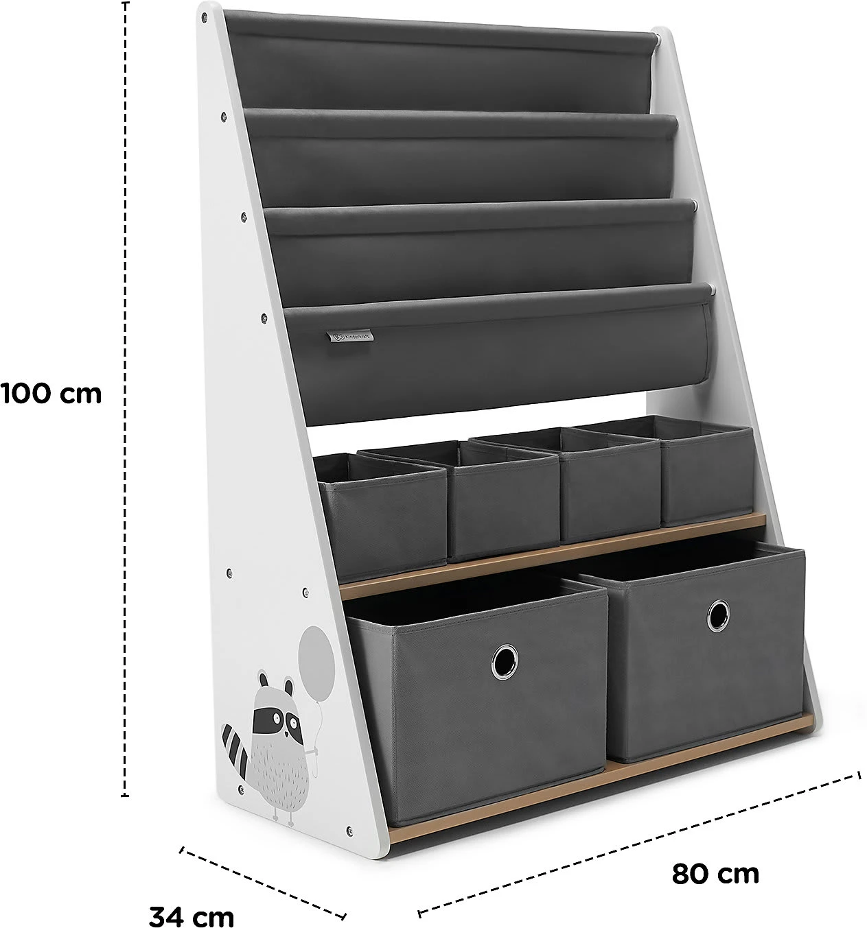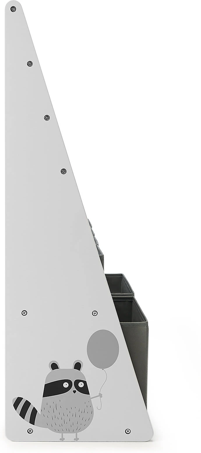 Das Bücherregal RACOON von Kinderkraft überzeugt durch seine solide Konstruktion (der untere Teil ist breiter) und die Möglichkeit einer Wandbefestigung. Somit ist dieses Regal für Kinder sicher. Die Einlegeböden aus Stoff sowie die dazugehörigen Behälter für Spielsachen sorgen für umfangreichen Stauraum. An der Seite befindet sich ein entzückendes Waschbärmotiv. Das Regal eignet sich hervorragend zum Aufbewahren von Kinderbüchern, Spielen und Spielsachen. Es ist sehr praktisch – seine Höhe beträgt 100 Zentimeter, wodurch der Sprössling problemlos an die Behälter und Einlegeböden herankommt.