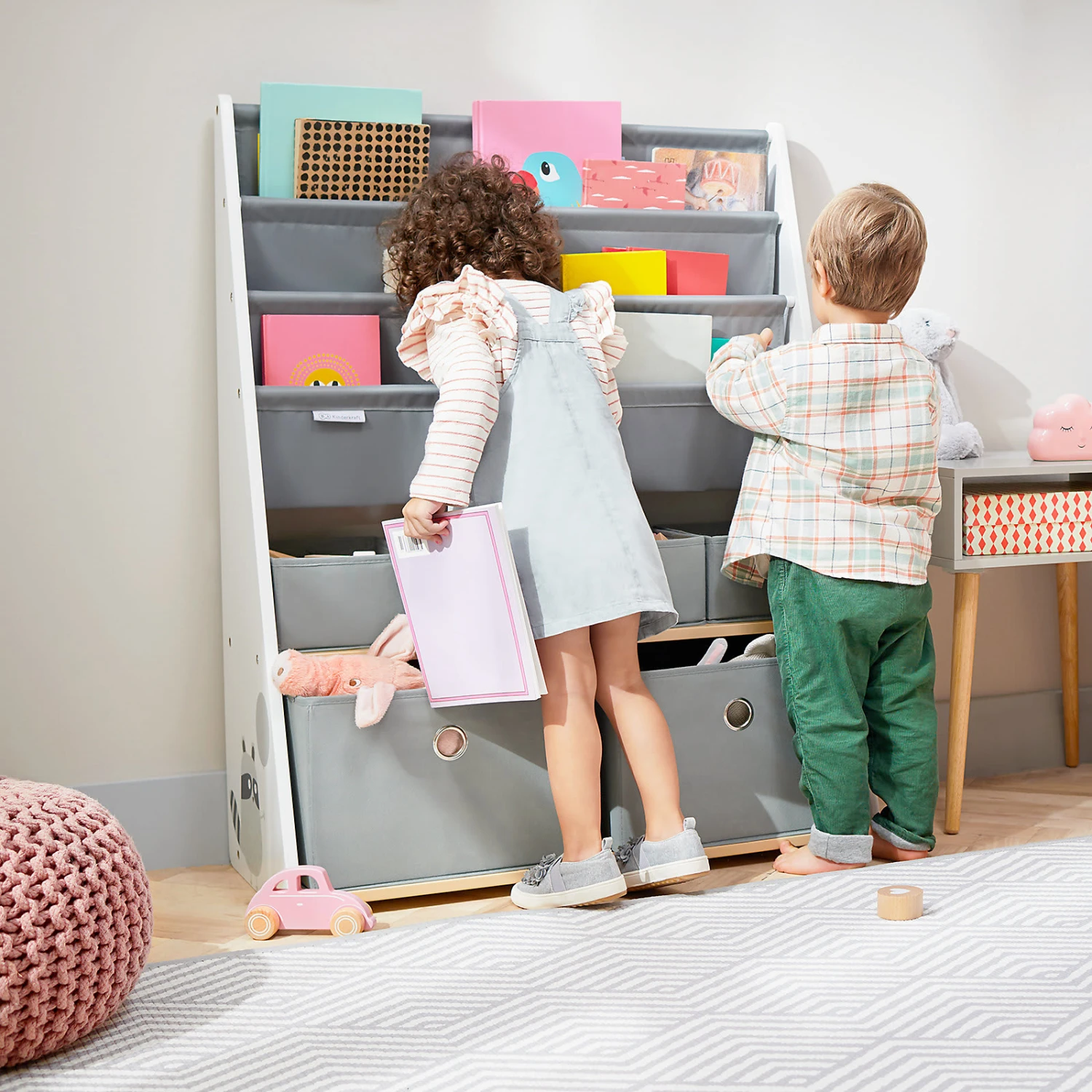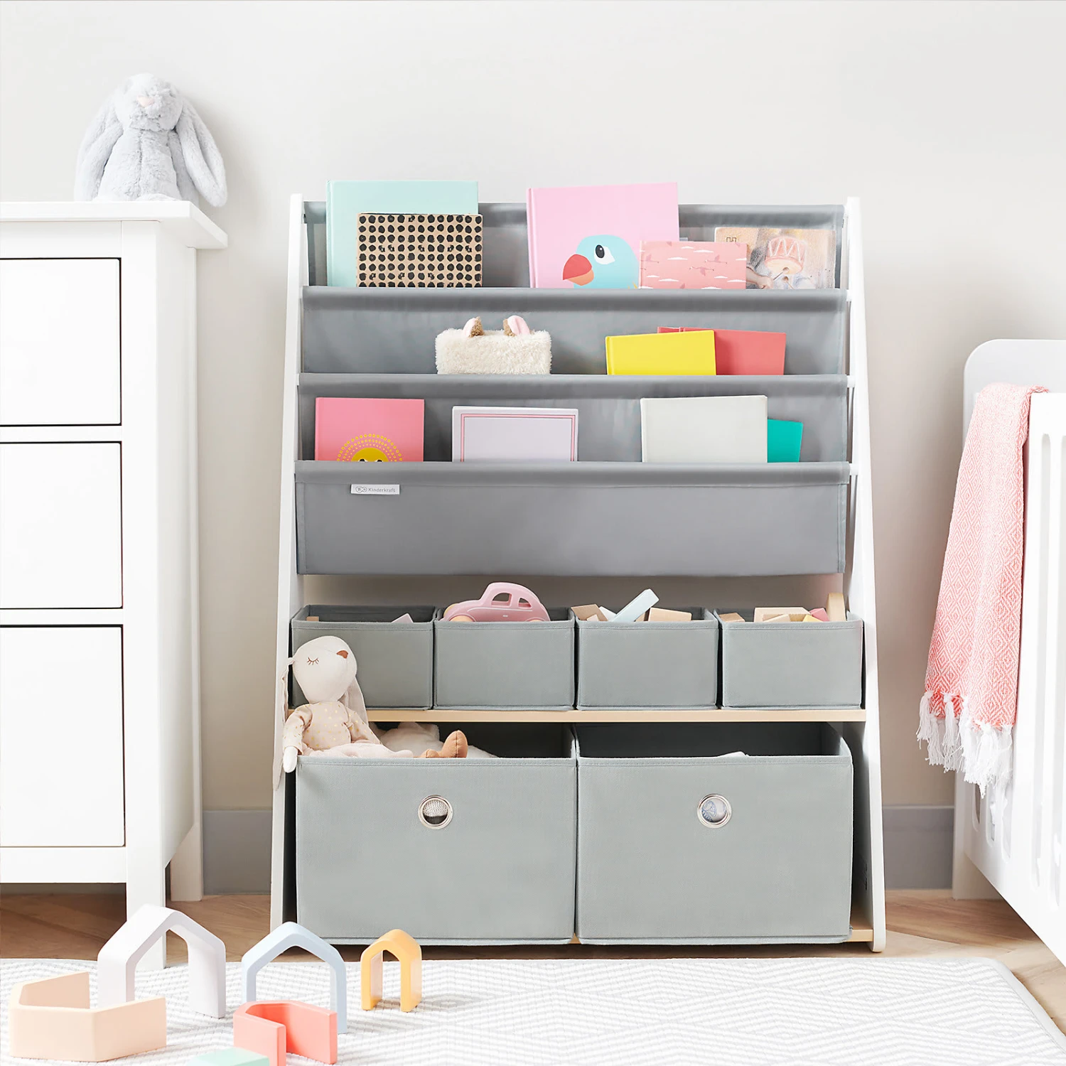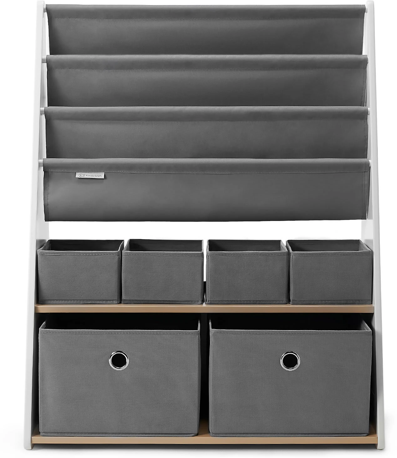 Das Bücherregal RACOON von Kinderkraft überzeugt durch seine solide Konstruktion (der untere Teil ist breiter) und die Möglichkeit einer Wandbefestigung. Somit ist dieses Regal für Kinder sicher. Die Einlegeböden aus Stoff sowie die dazugehörigen Behälter für Spielsachen sorgen für umfangreichen Stauraum. An der Seite befindet sich ein entzückendes Waschbärmotiv. Das Regal eignet sich hervorragend zum Aufbewahren von Kinderbüchern, Spielen und Spielsachen. Es ist sehr praktisch – seine Höhe beträgt 100 Zentimeter, wodurch der Sprössling problemlos an die Behälter und Einlegeböden herankommt.
