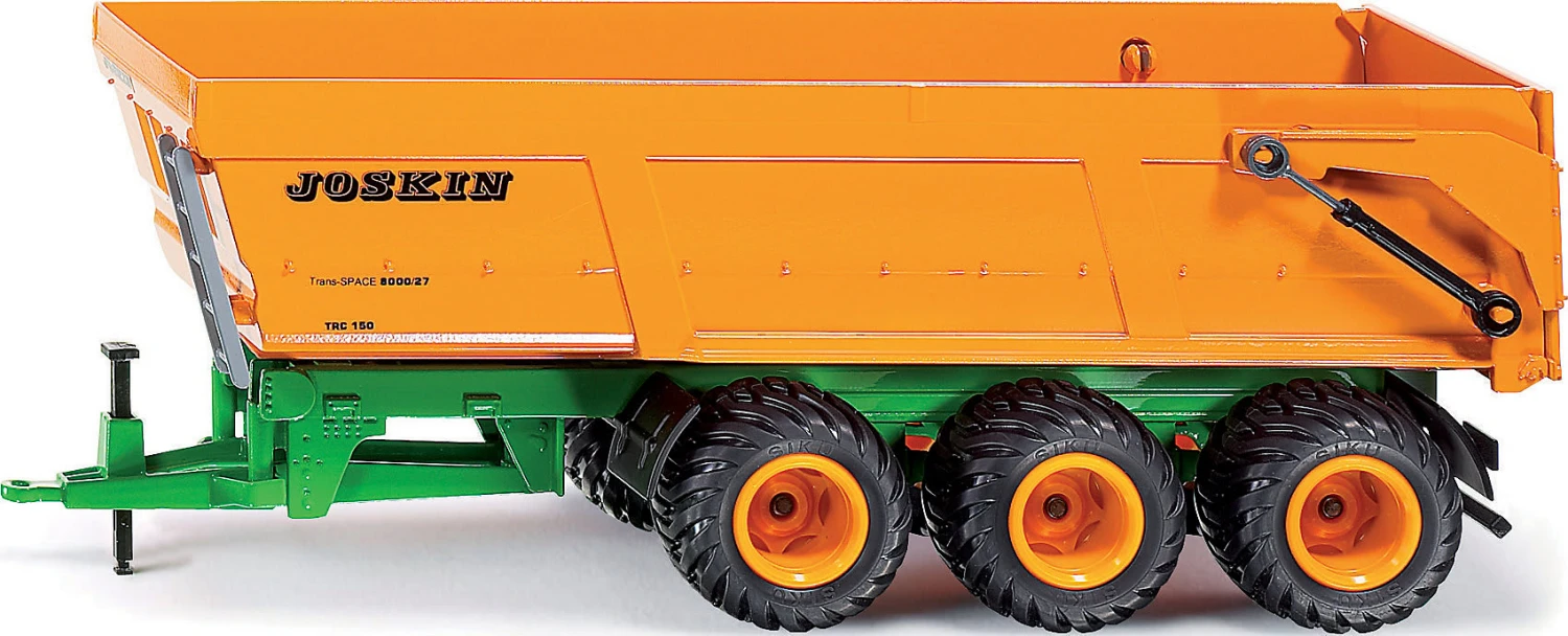 Wuchtiges Modell des Joskin-Muldenkippers Trans-Space in der größten Ausführung. 3-Achs-Fahrgestell aus Metall mit großem und voluminösen Luftreifen mit landwirtschaftlichem Profil. Die kippbare Mulde mit zu öffnender Heckklappe ist aus robustem Kunststoff gefertigt.